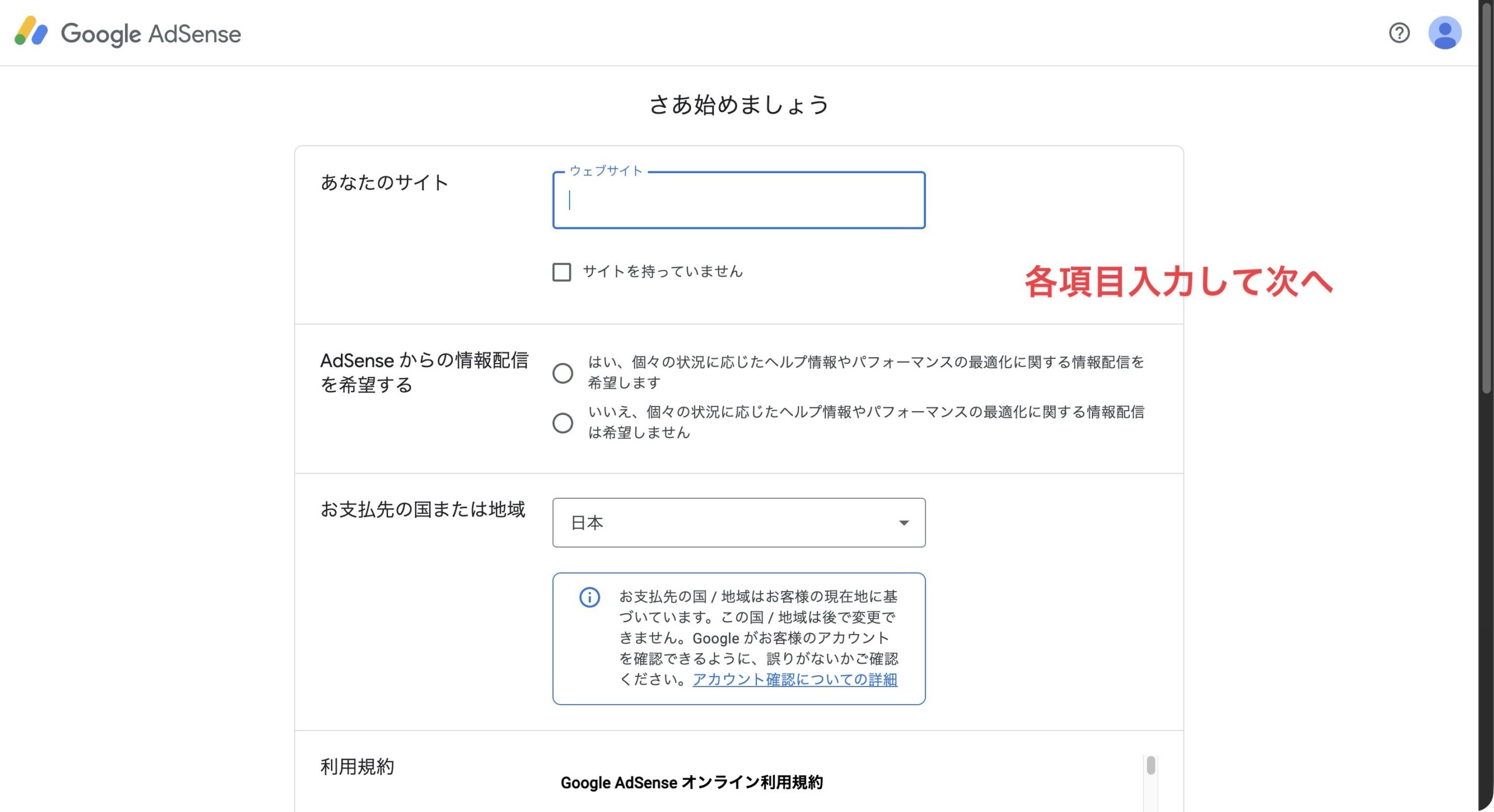 お申し込みは、こちらのGoogle AdSenseのお申込みページへアクセスして行ってください。